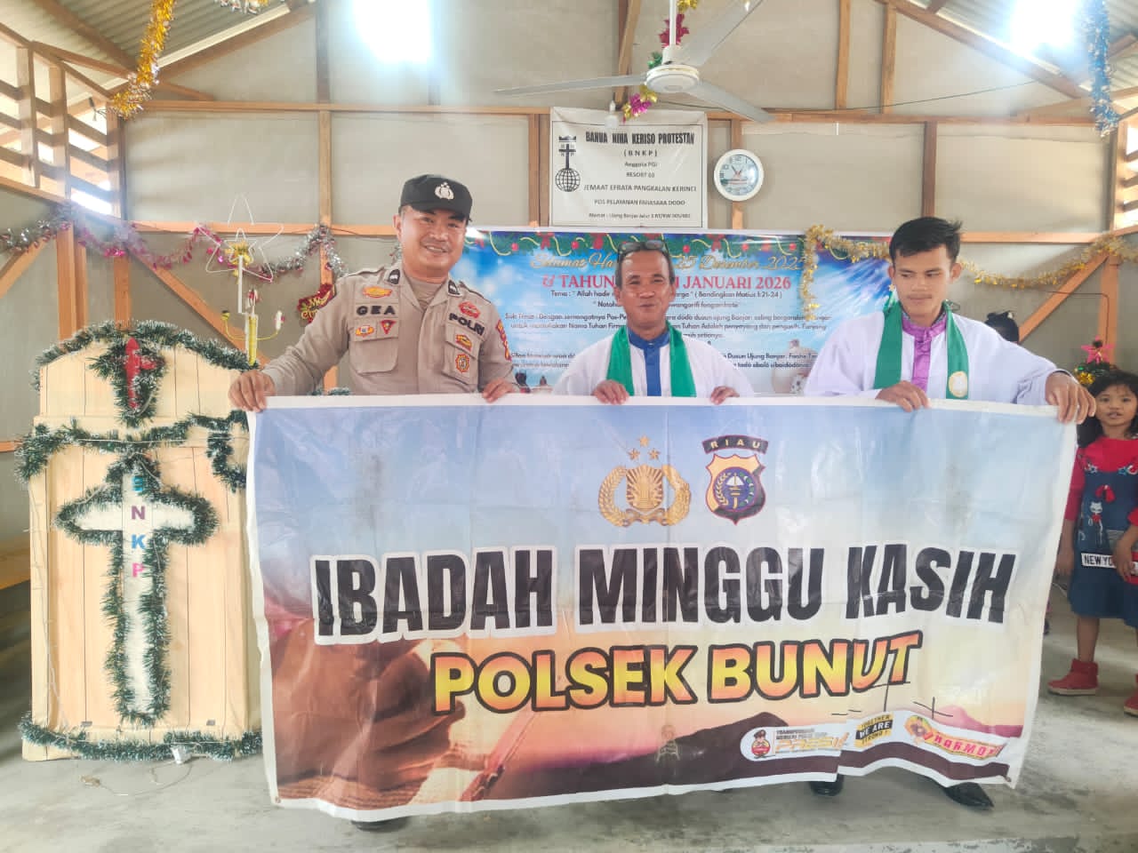 A1news.co.id | RIAU ||Polsek Bunut, Polres Pelalawan, menggelar Ibadah Minggu Kasih atau yang dikenal dengan Minggu Harmoni di Rumah Ibadah BNKP Desa Merbau, Kecamatan Bunut, Minggu (22/2/2026). Kegiatan berlangsung sejak pukul 11.00 WIB hingga 12.30 WIB dan berjalan aman serta lancar.
