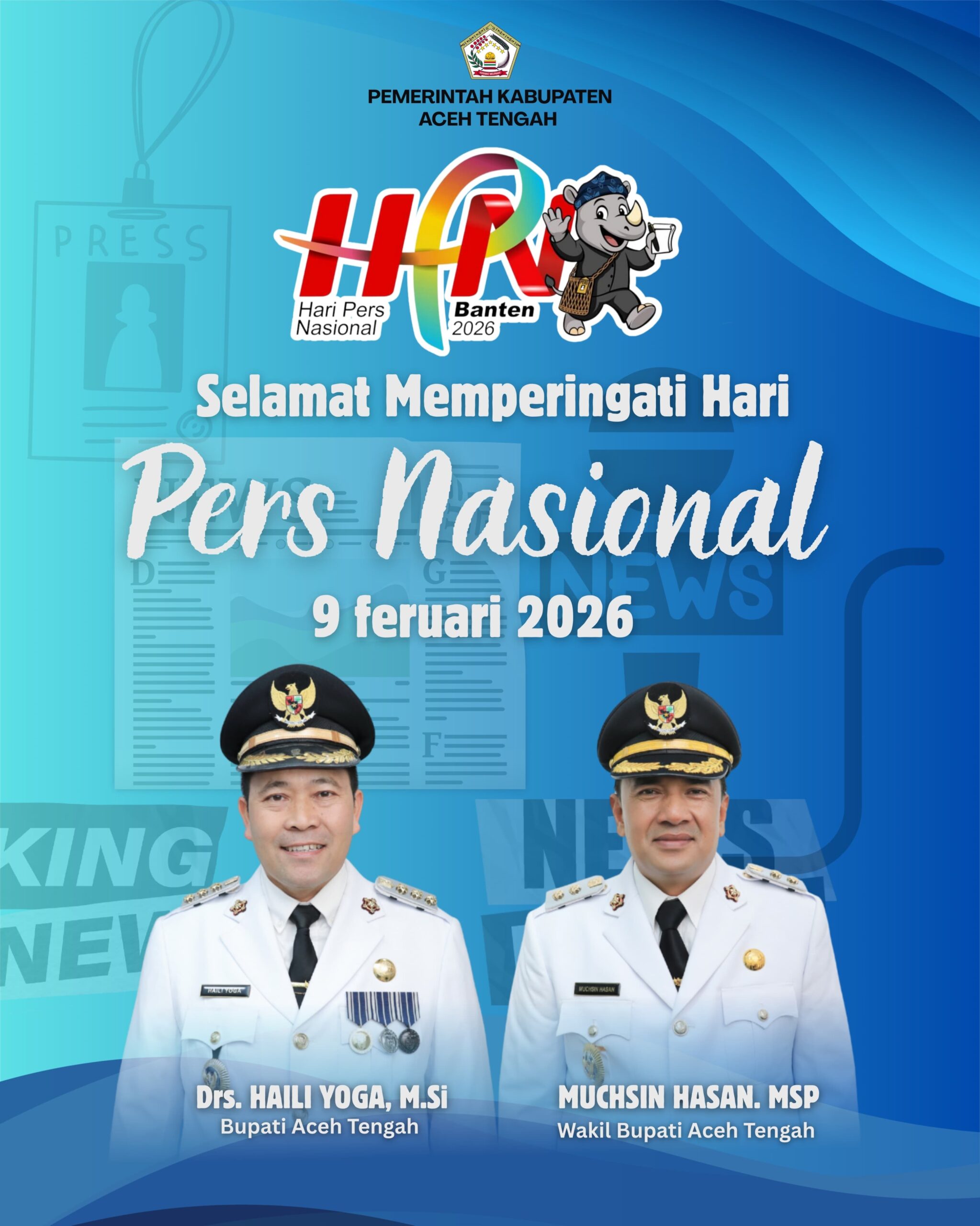 A1news.co.id|Takengon – Bupati Aceh Tengah Drs. Haili Yoga, M.Si bersama Wakil Bupati Aceh Tengah, Muchsin Hasan, MSP menyampaikan ucapan selamat memperingati Hari Pers Nasional (HPN) tahun 2026 kepada seluruh insan pers, khususnya yang bertugas di Kabupaten Aceh Tengah.
