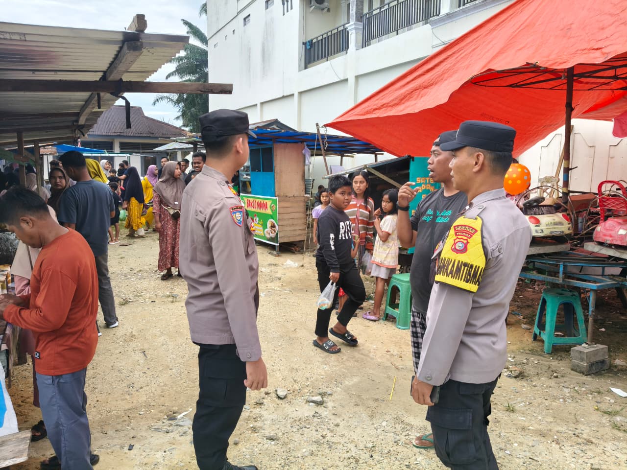 Personel Polsek Kerumutan bertugas mengamankan area pasar dan jalur sekitar yang ramai dilalui masyarakat, serta mengatur arus lalu lintas agar tetap tertib. Selain itu, petugas memberikan imbauan keamanan kepada pedagang dan pengunjung, termasuk menjaga barang berharga dan keselamatan diri.