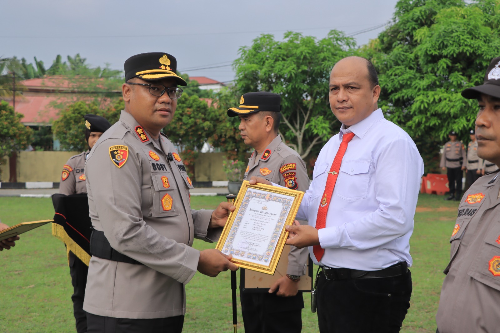 Sebelum penyerahan penghargaan ini terlebih dahulu dibacakan Surat Keputusan Kapolres Kampar tentang nama-nama penerima penghargaan ini, selanjutnya para penerima penghargaan maju ke depan Inspektur Upacara dan menerima piagam penghargaan dari Kapolres Kampar.