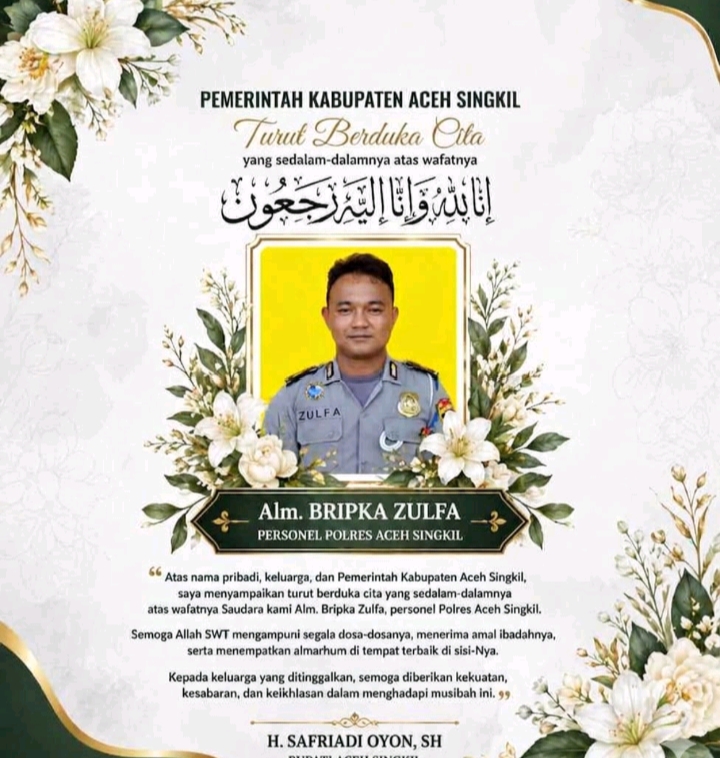 “Atas nama Pemerintah Kabupaten Aceh Singkil, kami menyampaikan turut berduka cita yang sedalam-dalamnya atas wafatnya Bripka Zulfa. Semoga almarhum husnul khatimah, diampuni segala dosa-dosanya, dan ditempatkan di sisi Allah SWT,” ujar Bupati.