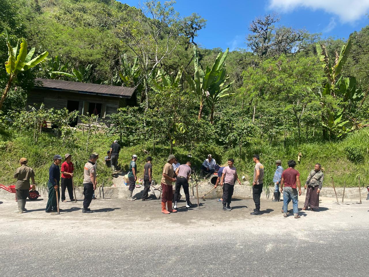 Dengan peralatan sederhana namun semangat kebersamaan yang tinggi, personel Brimob bahu-membahu bersama aparatur pemerintah desa serta masyarakat setempat membersihkan longsoran pasir di jalan dan meratakan permukaan demi menciptakan akses jalan yang lebih aman dan nyaman.